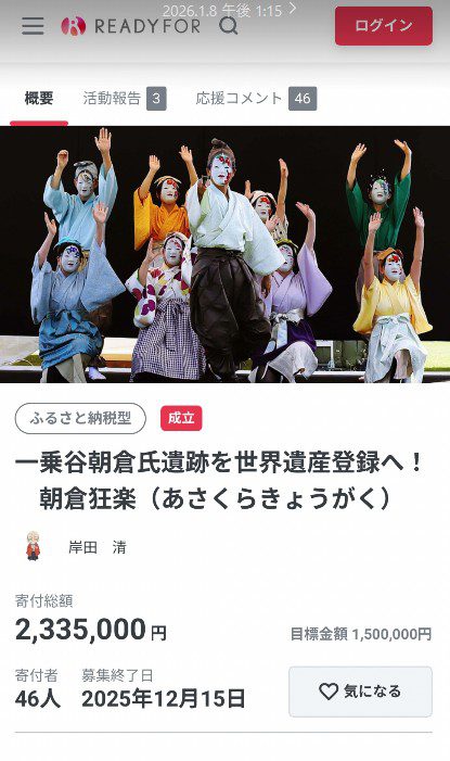 - 10,000円コース: 朝倉狂楽特別鑑賞席(2名様)+オリジナルクリアファイル2種+寄付金受領証明書(11月JTBツアーにて観賞)